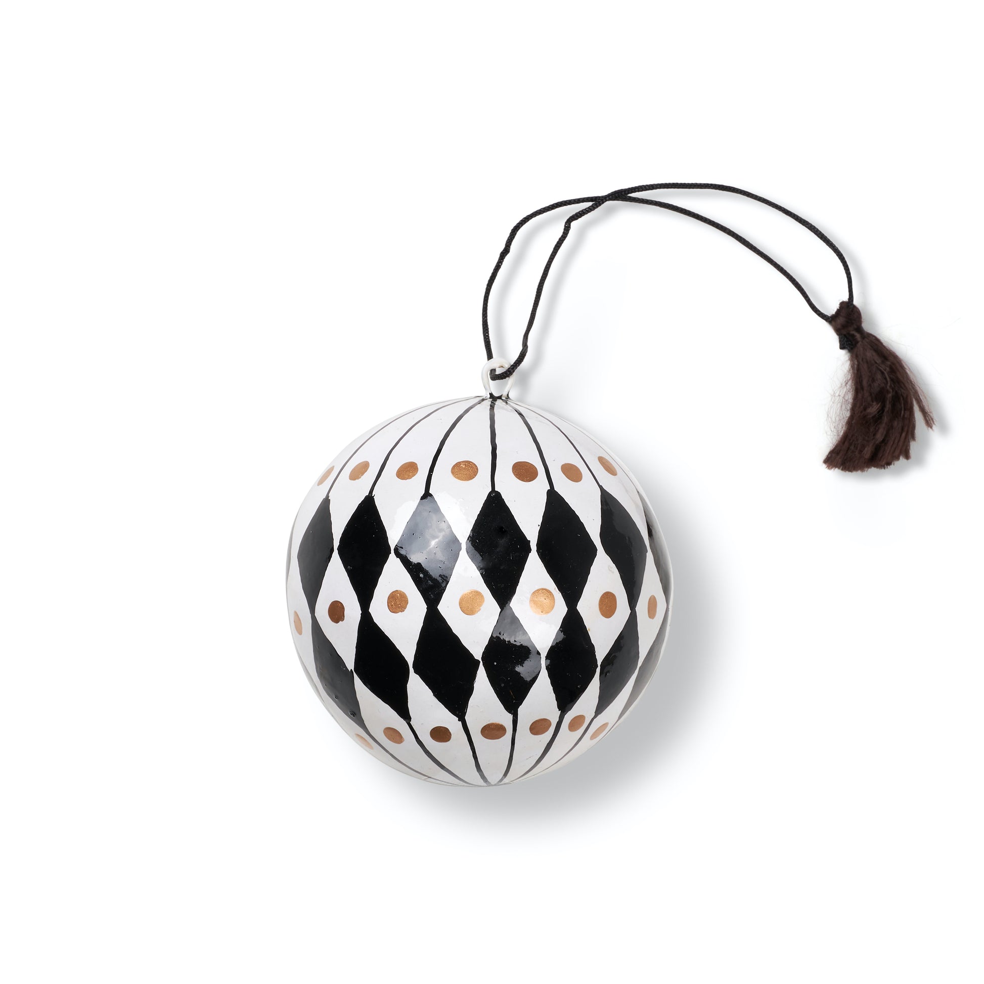 Beautifully hand painted paper maché baubles in 4 simple designs, black string with a dark brown tassel. A wonderful sustainable option for your Christmas tree.
