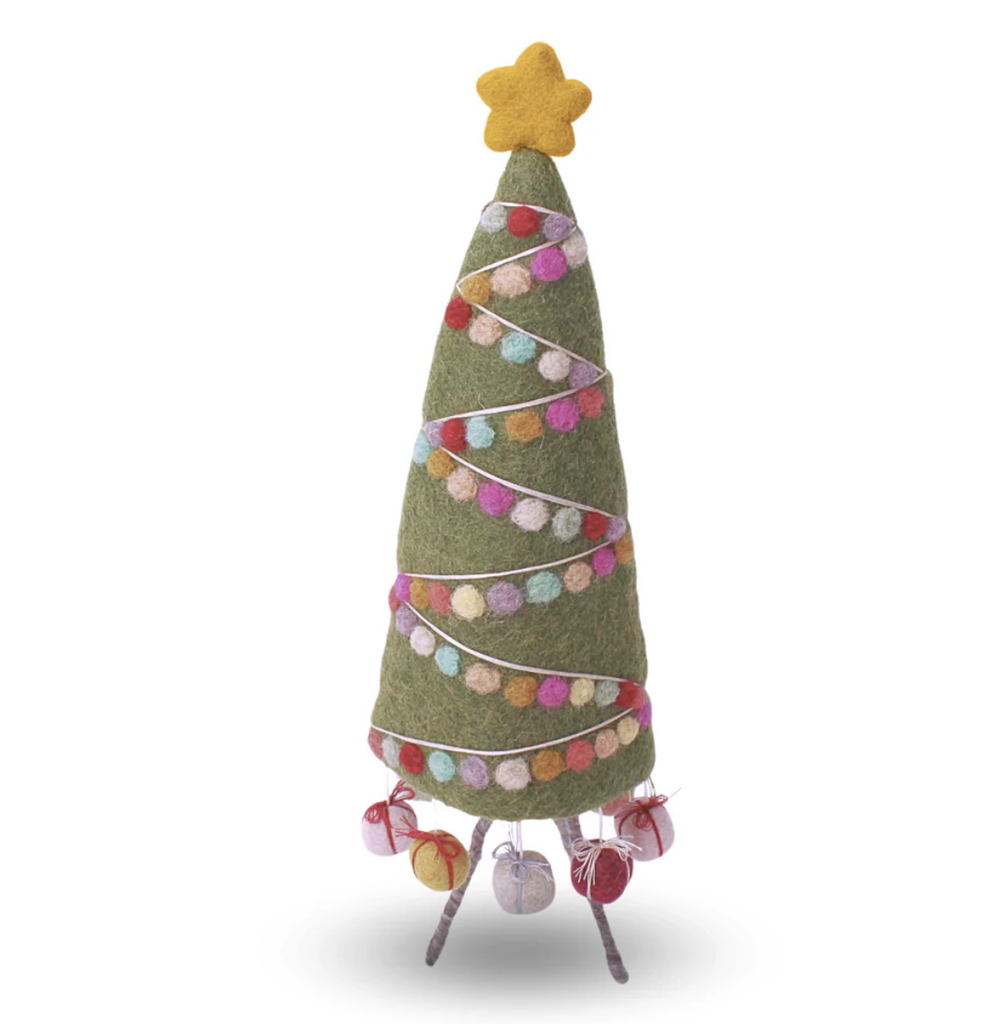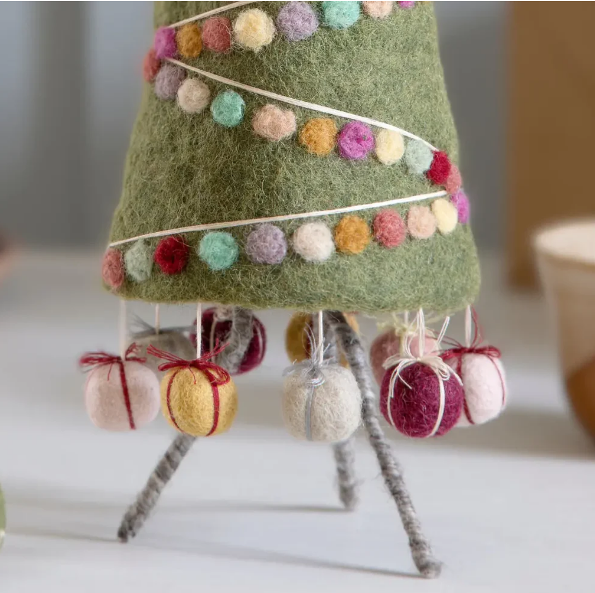 Hand-crafted from natural wool, Gry & Sif's delightful felted items are brimming with personality and their charm is hard to resist. This Christmas tree with garland and hanging presents make a delightful ornament to stand and place around the home.