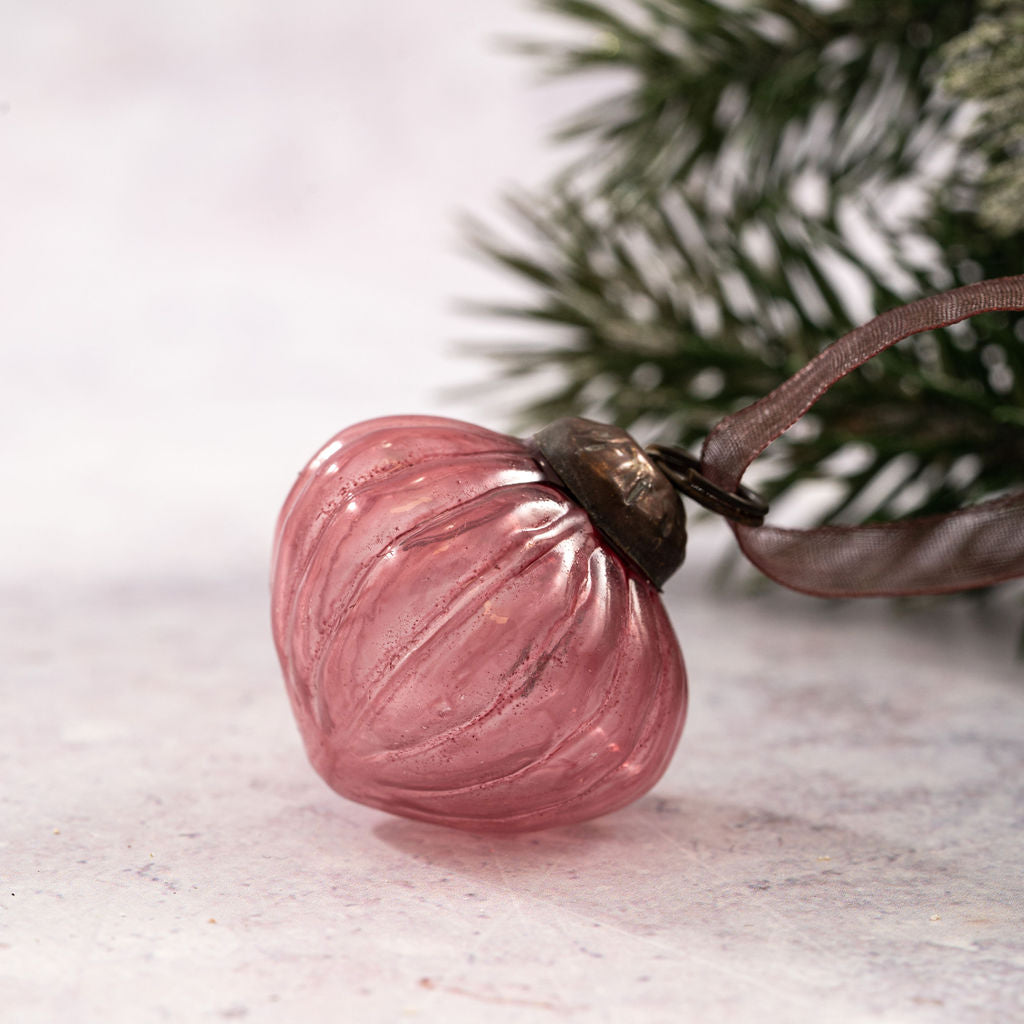 Each bauble has an ornately detailed bronze cap and co-ordinating coloured tie.