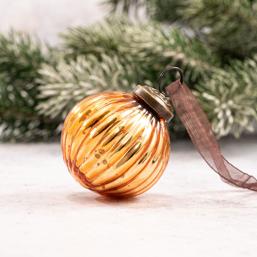 A Medium sized hand-blown ribbed glass ball with an ornate bronze cap and co-ordinating coloured organza ribbon.