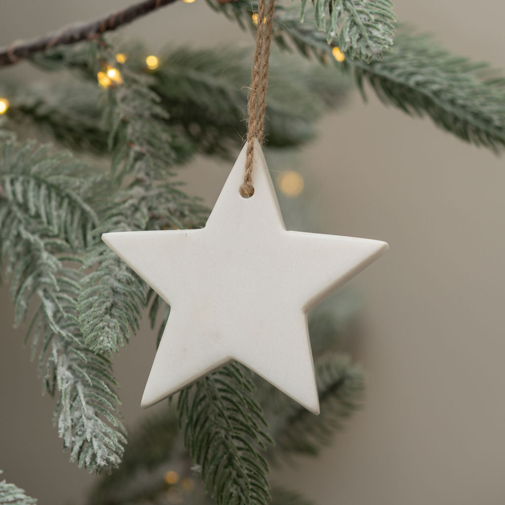 Add a touch of whimsy to your home with our stunning White Marble Hanging Star Decoration. Each 10cm x 1cm thick star is delicately crafted using traditional methods and sourced from India. Its simple design and Scandi vibes make it the perfect addition to any decor.