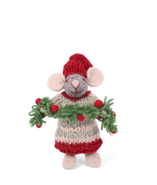 Hand-crafted from natural wool, Gry & Sif's delightful felted characters are brimming with personality and their charm is hard to resist. This cute mouse holding a sweet garland makes a delightful ornament to stand or hang on the Christmas tree.
