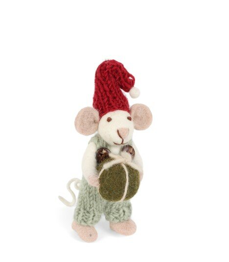Hand-crafted from natural wool, Gry & Sif's delightful felted characters are brimming with personality and their charm is hard to resist. This cute mouse wearing green pants and holding a sweet little makes a delightful ornament to stand or hang on the Christmas tree.