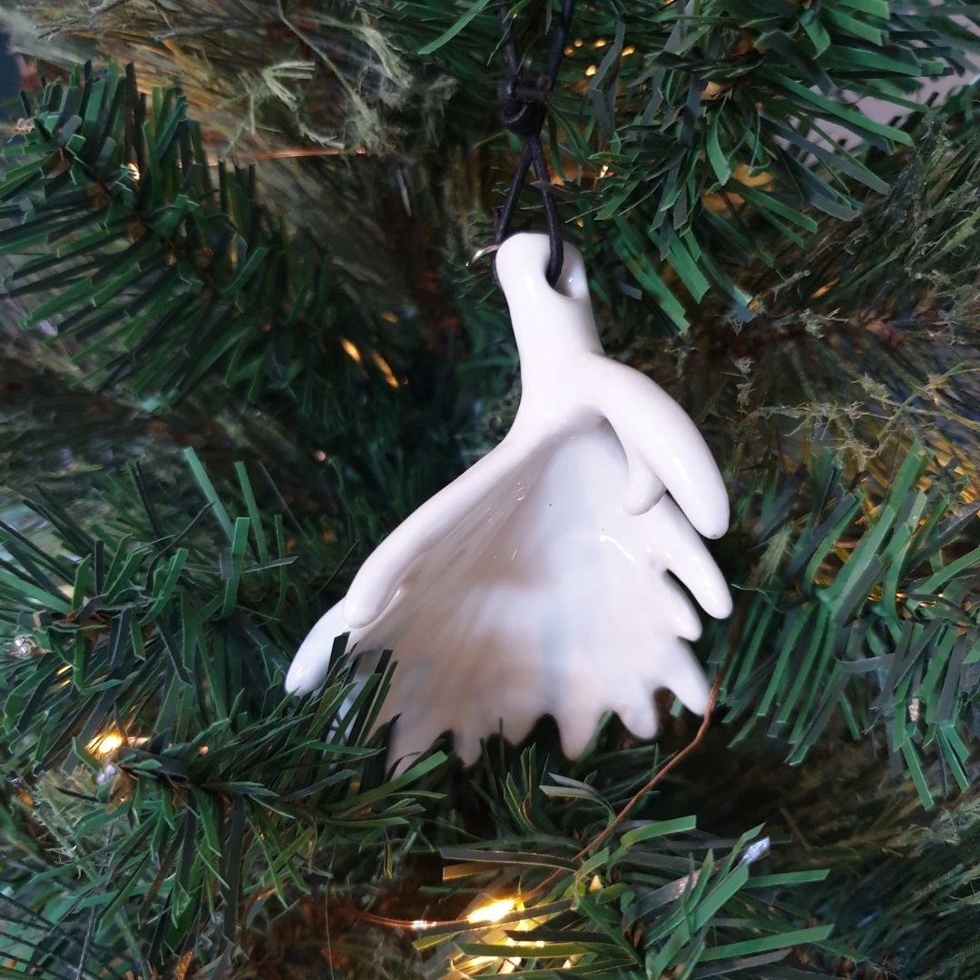 Christmas ornament in white glazed porcelain in the shape of an antler - attached to a black leather string.