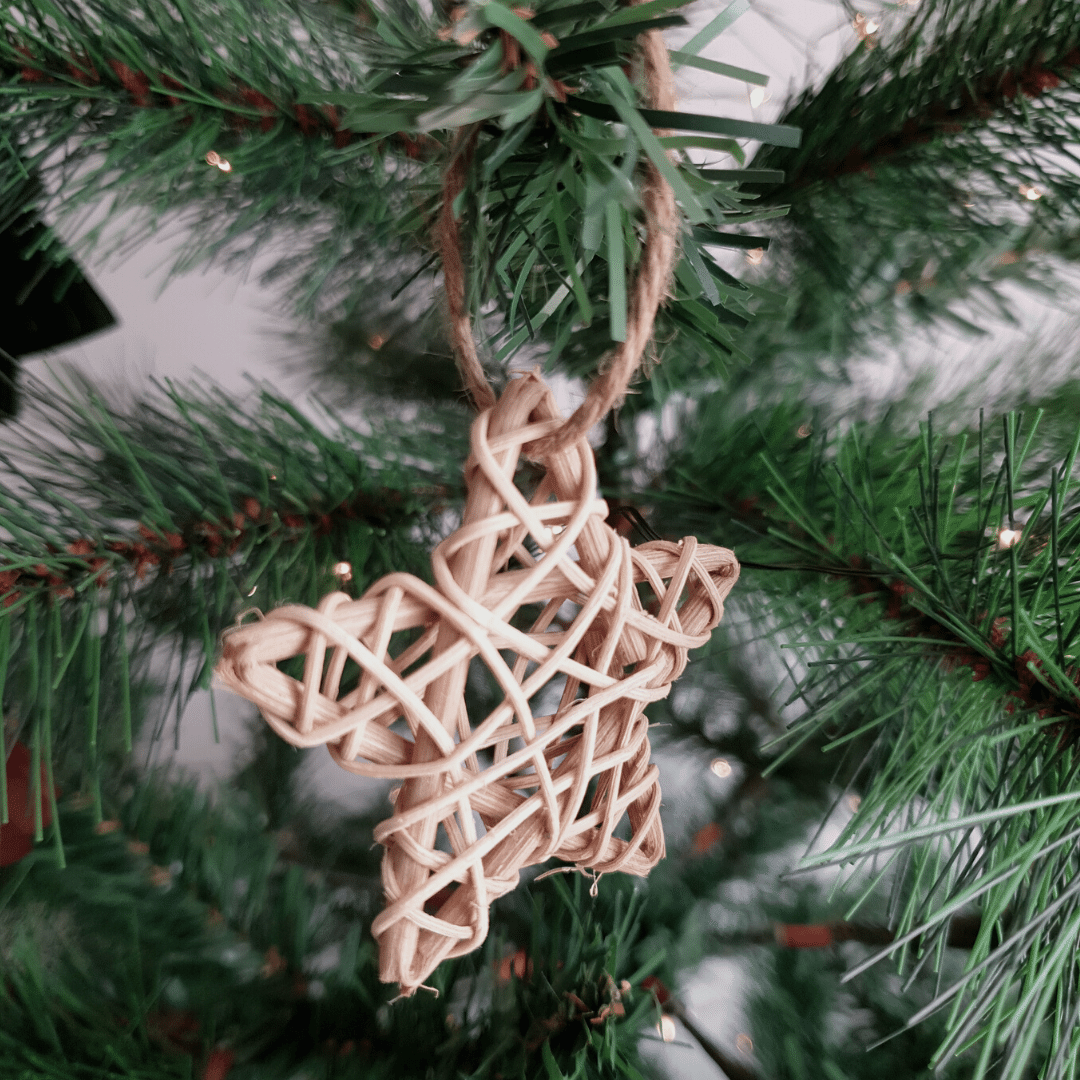 Christmas ornament in white rattan in the shape of a star - attached to a jute string.